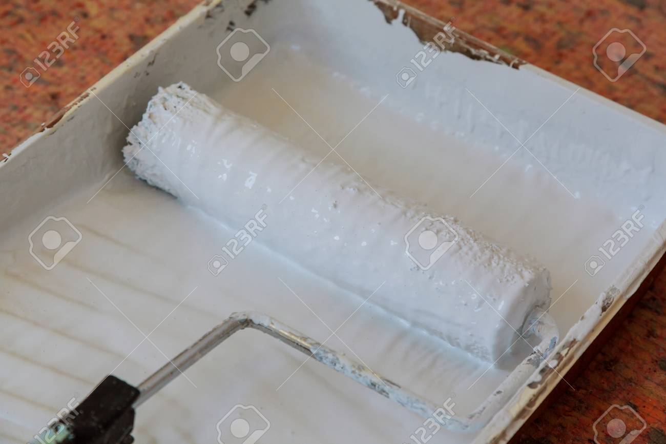 Peindre Un Mur Rugueux Avec De La Peinture Au Latex Blanc. Il S'agit D'une Première Peinture De Murs Dans Une Nouvelle Pièce. Le Rouleau à Peinture A Laissé Une Trace Sur Le